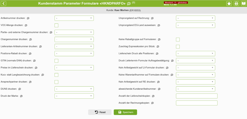 | Keine Warentarifnummer auf Formulare drucken | Dieses Feld schaltet für diesen Kunden in den von Ihnen gewählten Formularen die Anzeige der Warentarifnummer aus. Achtung! Falls die Warentarifnummer für ein Formular ausgeschaltet werden soll und dieser Schalter für dieses Formular noch nicht eingerichtet wurde, bitten wir Sie, einen Mitarbeiter von globalerp zu kontaktieren |